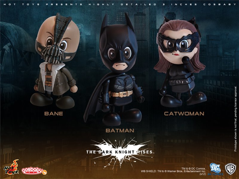 E do tão aguardado Batman: O Cavaleiro das Trevas Ressurge prestes a estrear no final de julho temos o Batman, o Bane e a Mulher-Gato como cosbabies!