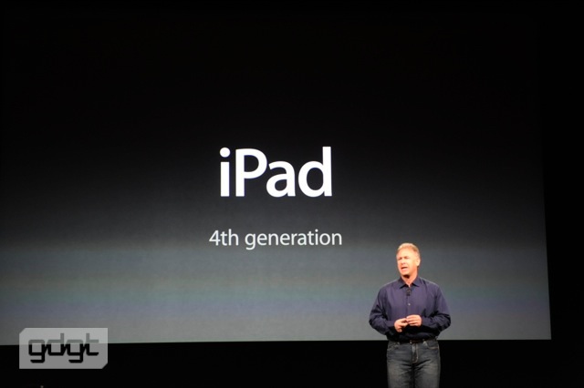 [typography font=”Cantarell” size=”15″ size_format=”px”]Para a surpresa de todos que acompanhavam a conferência, a Apple anunciou a quarta geração do iPad apenas 6 meses depois de ter lançado a terceira geração, que há duas semanas atingiu o número impressionante de 100 milhões de unidades vendidas.[/typography]