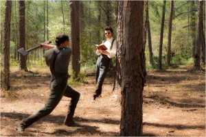 Como pudemos perceber, nosso protagonista não se dá muito bem com armas de fogo. Então ele escolhe como arma um machado. Pensei “aí sim heim! Quero ver ele treinar muito agora a la A Noiva em Kill Bill para decepar várias cabeças ao longo do filme”. E eu estava novamente enganada. Sim, ele decepa várias cabeças, mas quanto a parte do treinamento…