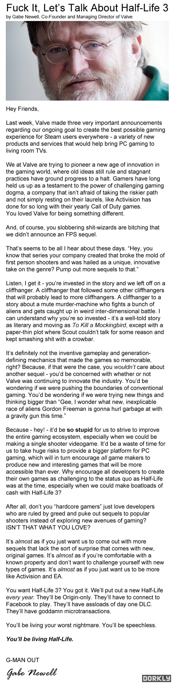 Uma carta deu o que falar esta semana, se trata da grande brincadeira pelo site Dorkly – onde temos Gabe Newell (chefe da Valve) – protoganizando uma série de comentários um tanto quanto desgastantes sobre o pedido dos fãs cada vez mais fervorosos a respeito do terceiro capítulo da série Half-Life. Em inglês, caso você tenha curiosidade pode conferir na imagem abaixo:
