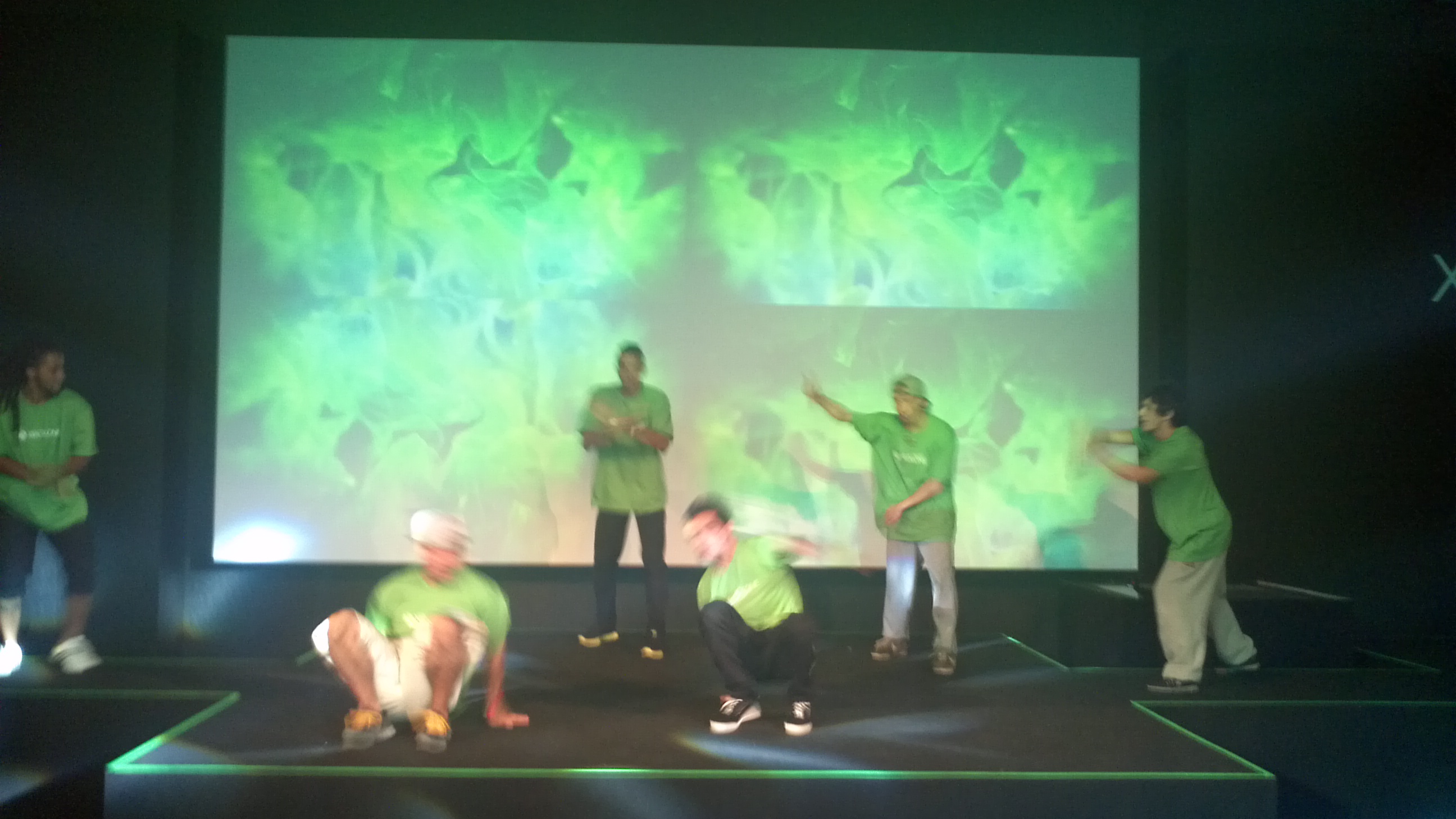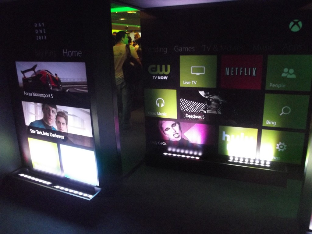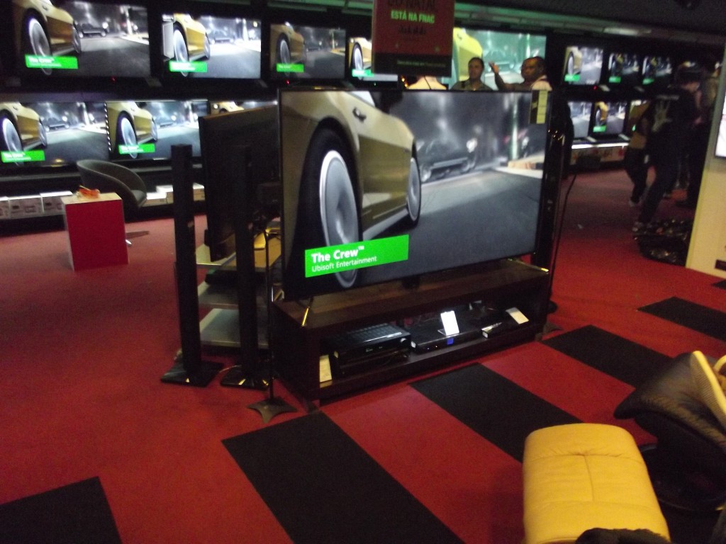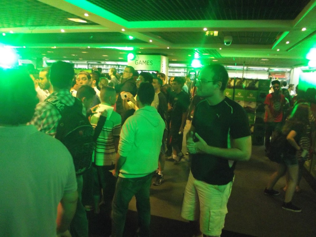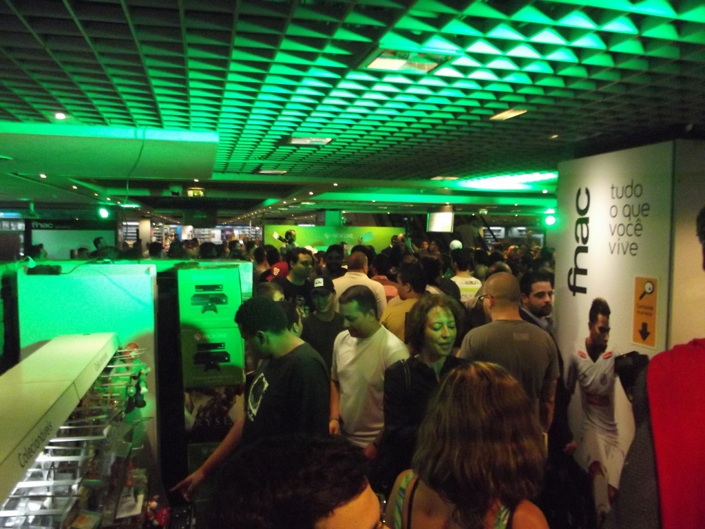 Logo de cara, o lugar estava todo decorado com imagens do Xbox, muitas luzes verdes no ambiente, inclusive todas televisões da loja estavam mostrando algo do console; além disso, tinha até uma DJ para animar o pessoal.