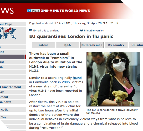 Por quê? O HOAX (farsa) é antigo, e precisamente em 2009 um grande boato se espalhou sobre um suposto vírus influencia direta do H1N1, mas que.. transformava pessoas em “zumbis” após a morte; a “brincadeirinha” foi levada adiante, e até chegamos a encontrar notícias como estas (imagem abaixo) dando uma “veracidade” sobre tal infecção que mudaria o rumo da humanidade.