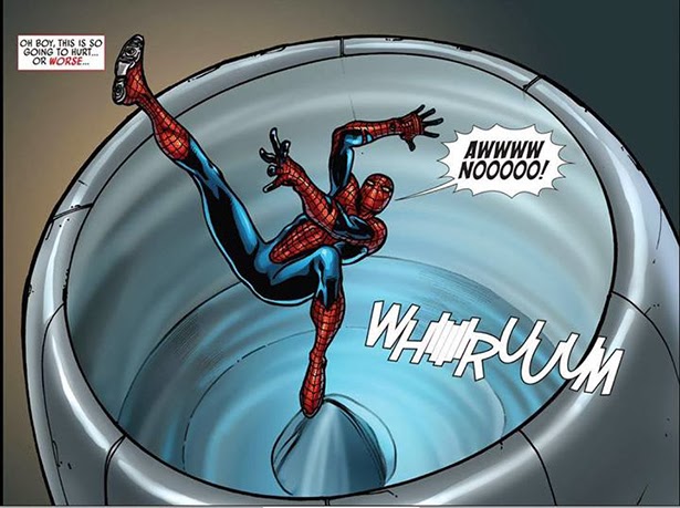 Mas a você, fanático por histórias, saiba que existe sim uma HQ explicando o prelúdio do segundo longa; ao que parece, em uma das aventuras de Peter.. ele acaba sendo puxado por um tipo de turbina, que resulta nos eventos abaixo: