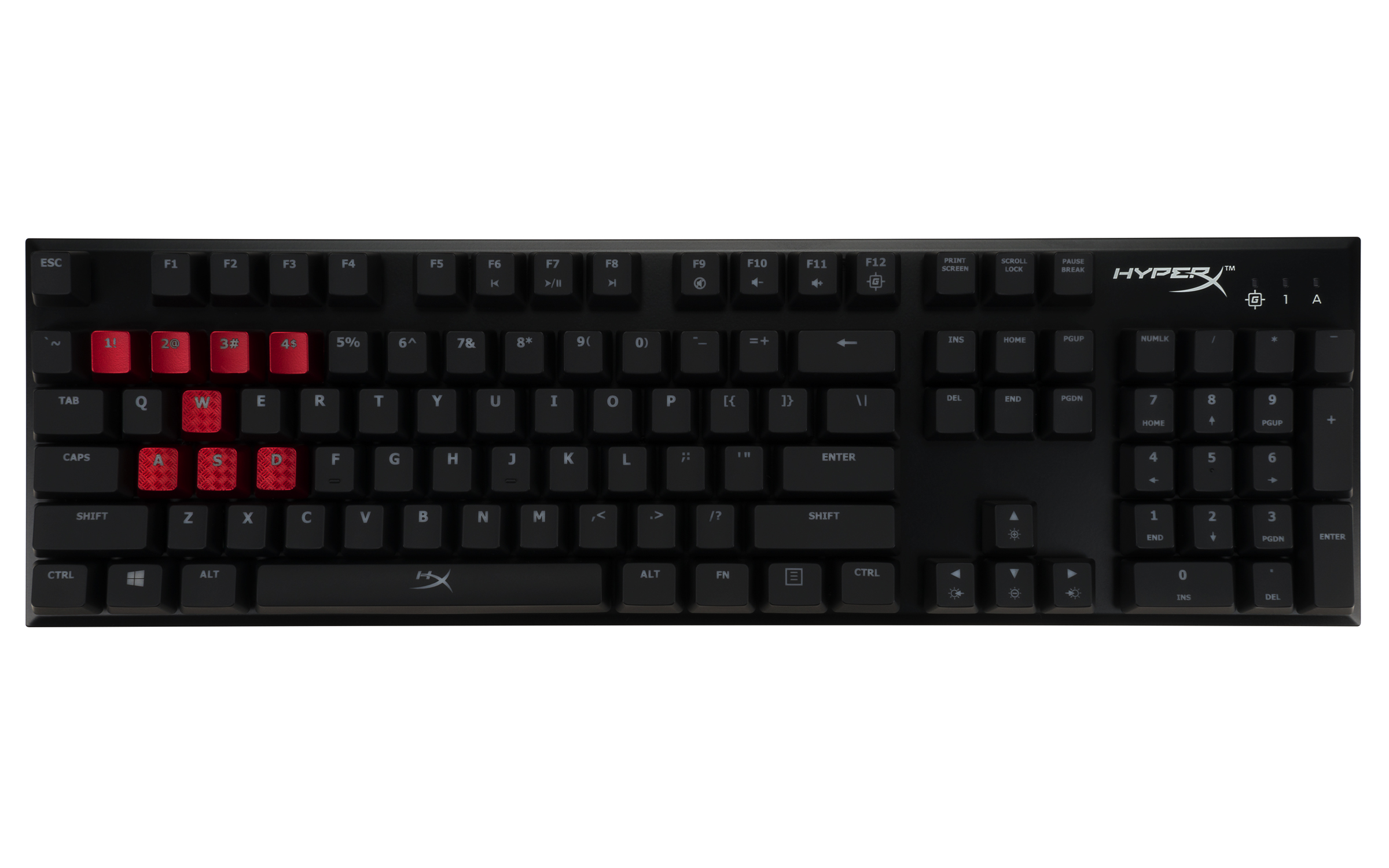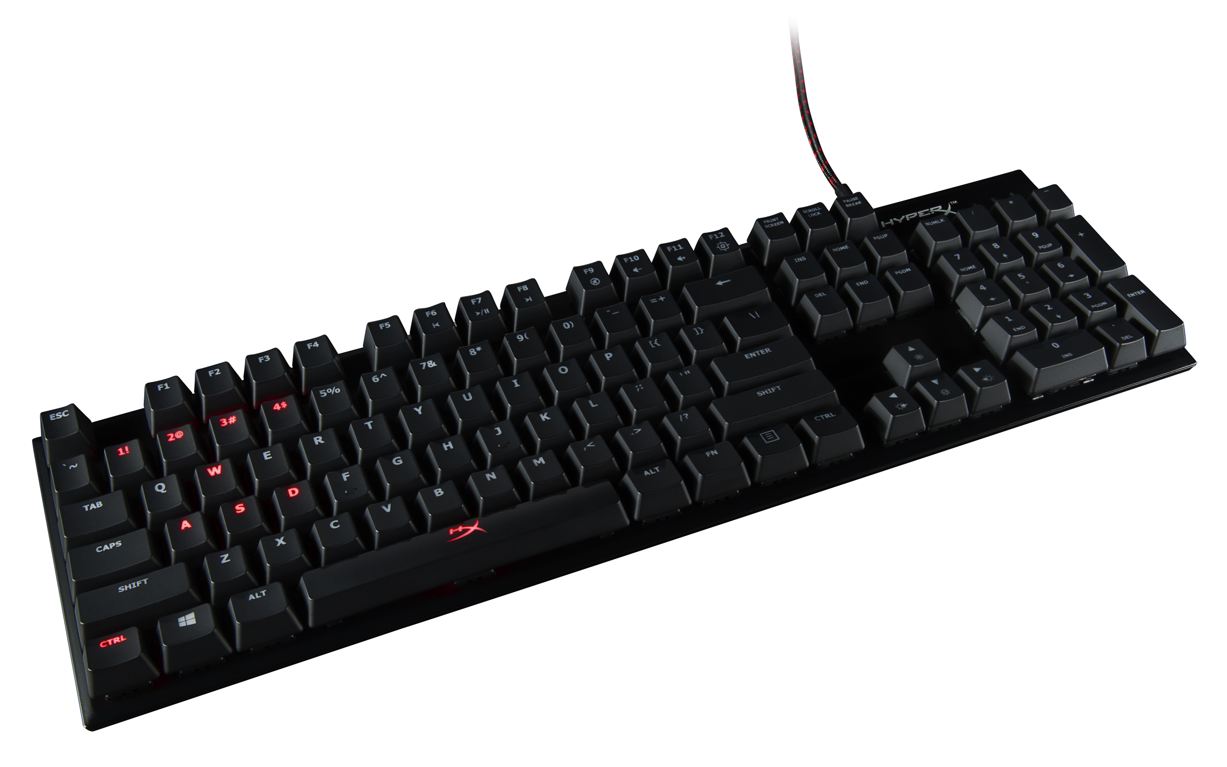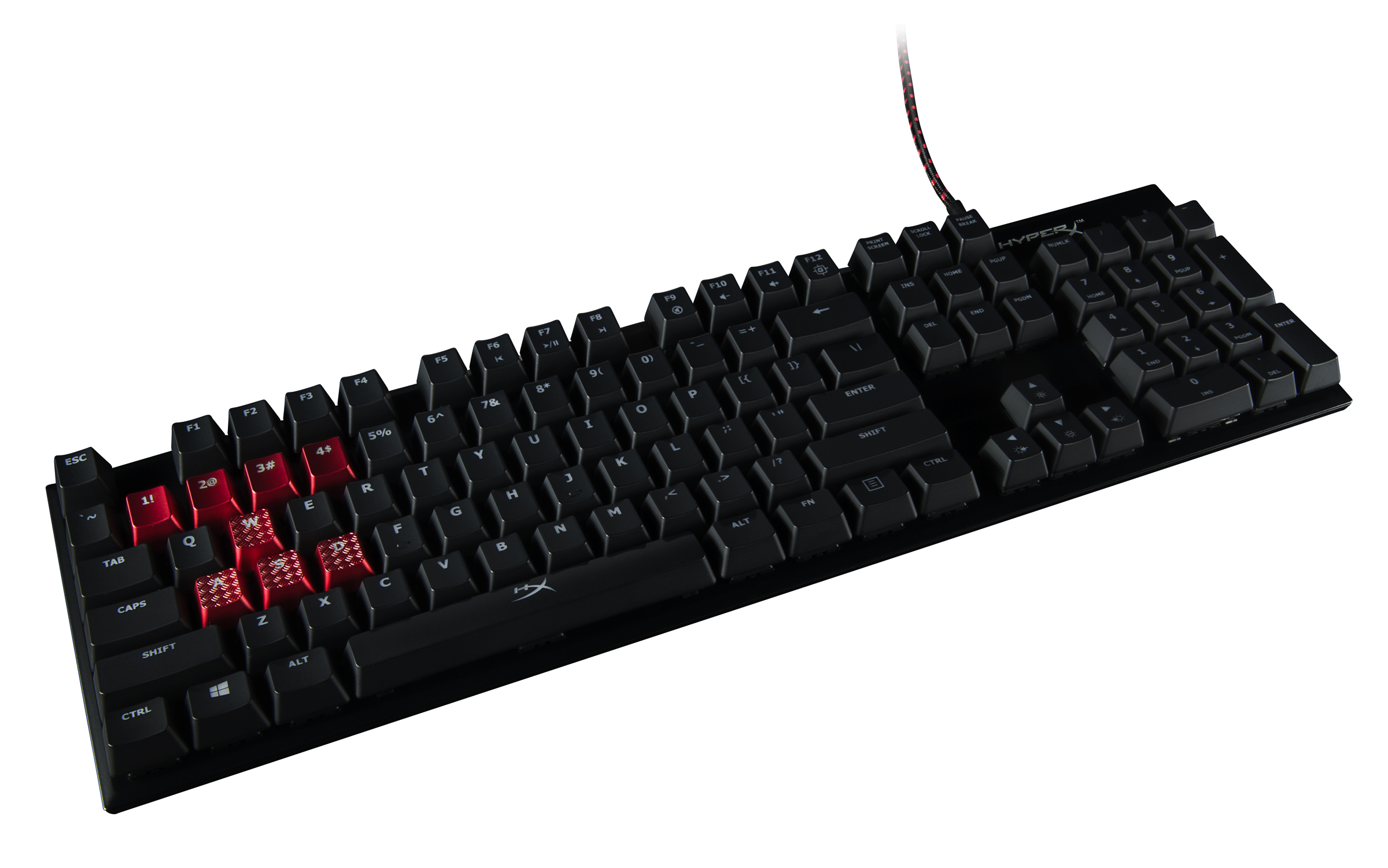 Fechando com chave de ouro, o HyperX Alloy FPS ainda acompanha teclas W, A, S, D com acabamento texturizado, vem com entrada USB para carga de celular e incorpora saída de energia com cabo trançado destacável.