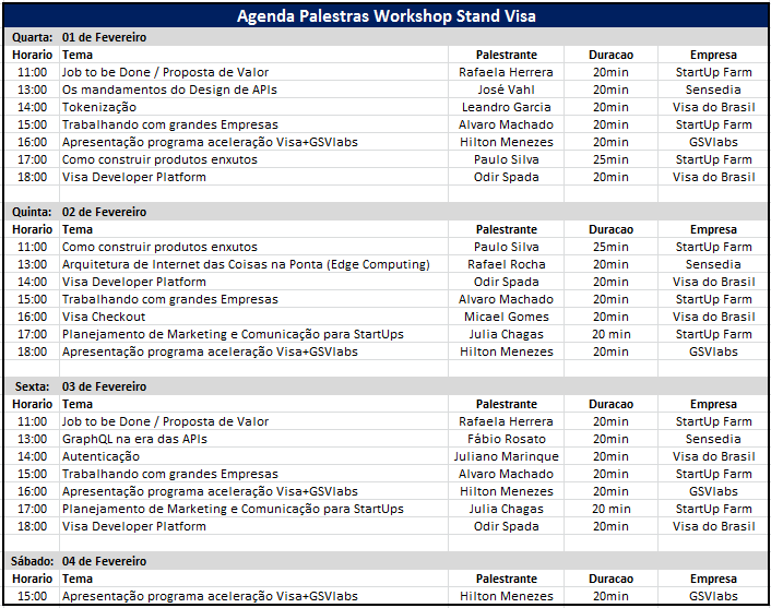 Voltado para o desenvolvimento de APIs “Application Programming Interface” (Interface de Programação de Aplicativos, em português), e soluções digitais para meios de pagamentos no Brasil, por meio do desenvolvimento de software, o hackaton terá como principal objetivo incentivar os novos talentos empreendedores participantes desta edição. Mentores formados por executivos Visa e Startup Farm acompanharão as equipes, de até 6 participantes, por 24 horas e a premiação será em dinheiro – 1º lugar R$15 mil, 2º lugar R$7 mil e 3º lugar R$3 mil. O anúncio dos vencedores será realizado junto aos outros hackatons do evento durante a cerimônia de encerramento da CP 2017.