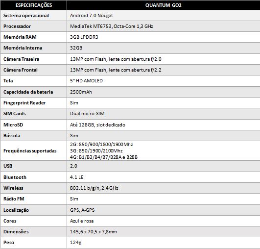 Reforçando a estratégia de ampliar o portfólio da marca, a QUANTUM traz aos seus clientes o Quantum GO 2, evolução do consagrado smartphone que em sua segunda edição acompanha tecnologia AMOLED e revestimento oleofóbico de tela reduz as marcas de toque e facilita a limpeza. Além disso, com 32GB de memória interna com a possibilidade de expansão para até 128GB é possível armazenar fotos, vídeos e aplicativos de sobra.