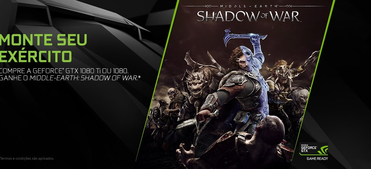 Ao comprar uma GeForce GTX 1080 ou GeForce GTX 1080 Ti, você leva totalmente gratuito o novíssimo Middle Earth: Shadow of War, o game será entregue como um código para você baixar pelo seu PC.