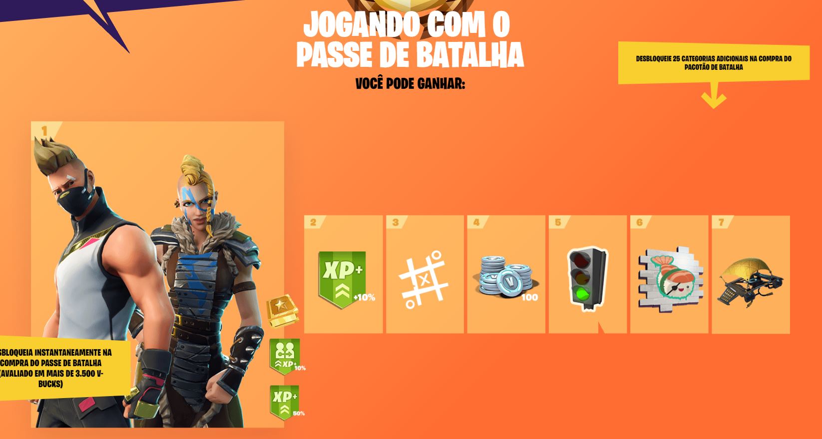 Se você puder investir no Battle Pass pago, vale a pena pois com 950 V-Bucks, aproximadamente R$30,00 você tem direito a todas missões semanais e um item diferente a cada nível do passe, com vários trajes entre outros. Dois novos trajes são progressivos, mais ou menos como duas que tivemos na temporada passada, quanto mais você jogar e ganhar XP, mais adereços ele vai recebendo.