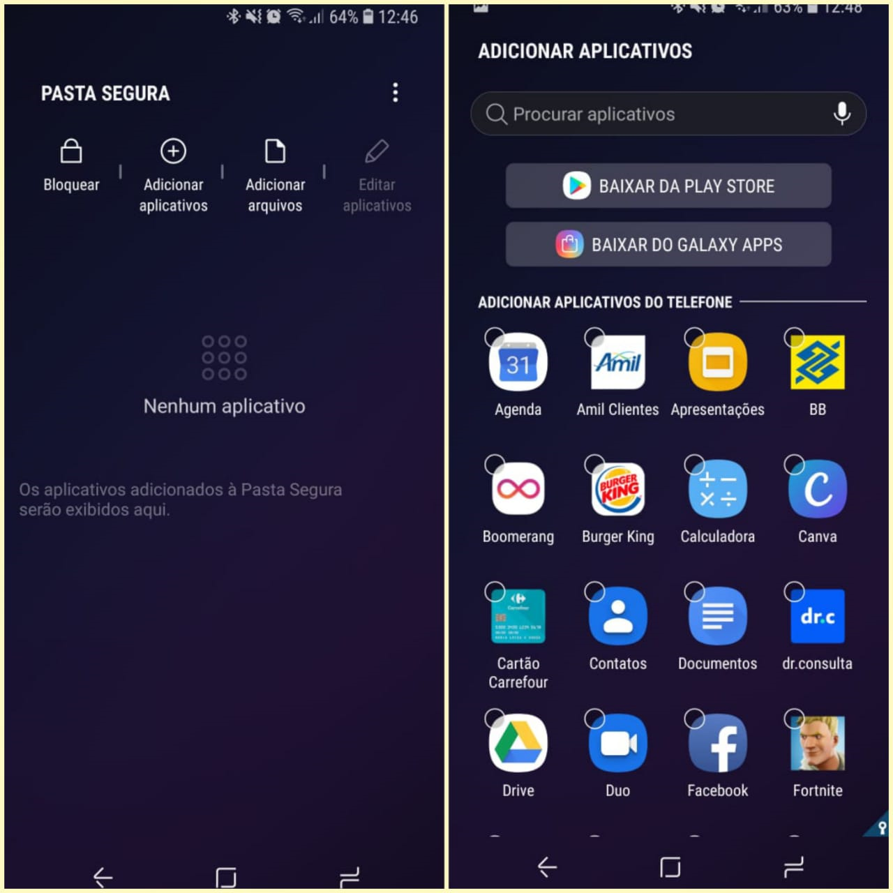 - Se o seu aparelho não possui a Pasta Segura, vá em Galaxy Apps ou Google Play> Procure “Pasta Segura” > Instale