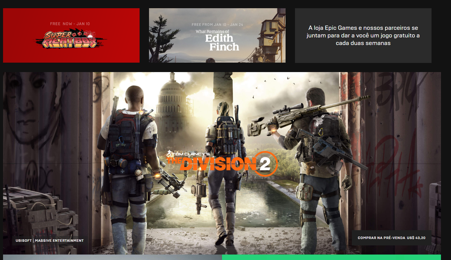 Vale lembrar que a Epic Store, a cada 15 dias, está disponibilizando jogos gratuitamente, já tivemos Subnautica, Super Meat Boy e a partir do dia 10, ficará disponível o game Edith Finch. The Division 2 será lançado dia 15 de Março para Playstation 4, PC e Xbox One.
