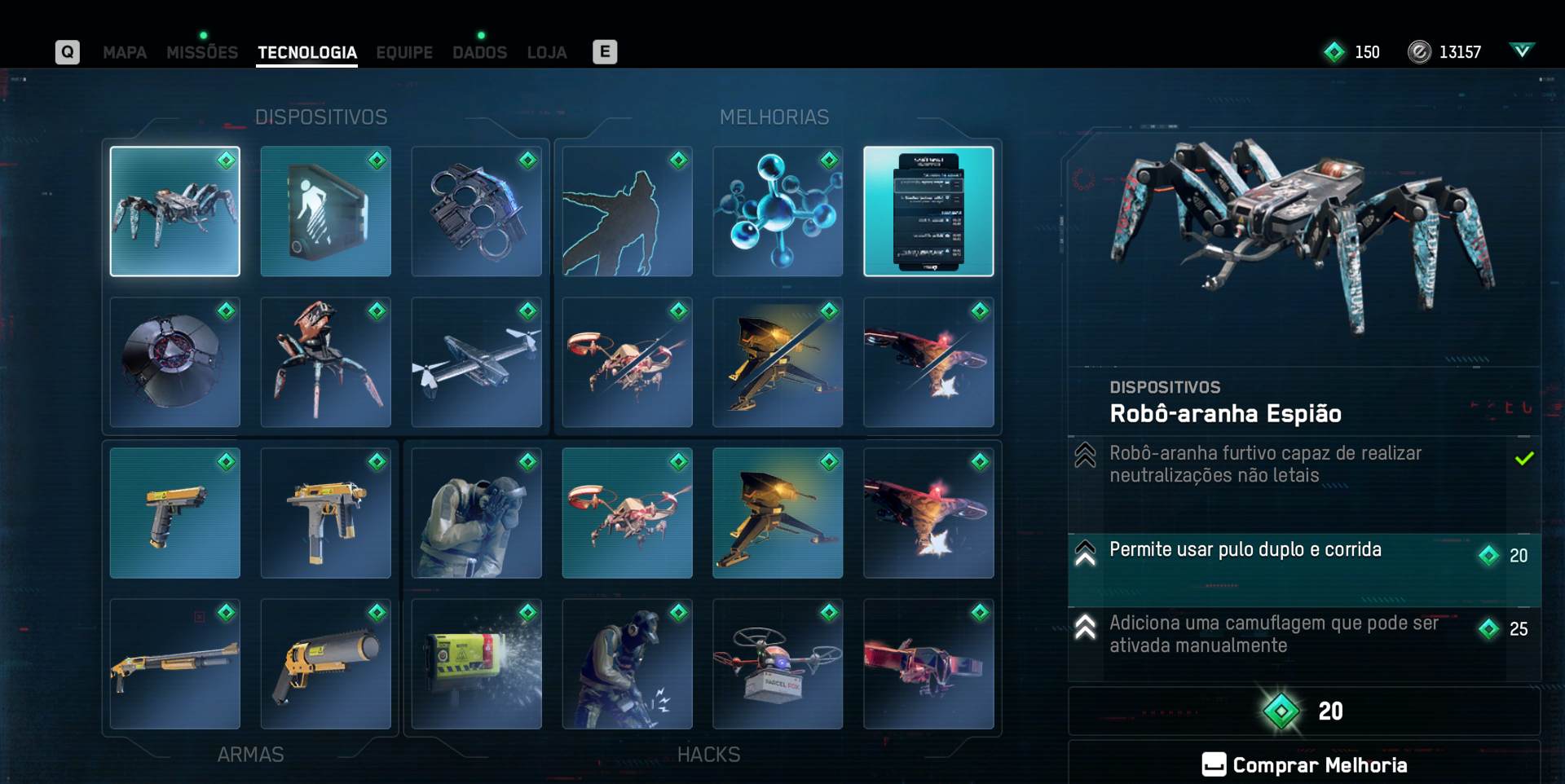 Toda a aba de tecnologia, é extremamente importante durante seu progresso, principalmente se estiver jogando em um nível de dificuldade mais alto, nela você escolhe as habilidades que seus personagens terão para conseguir vencer os desafios, algumas delas, você precisa além de desbloquear, também realizar o upgrade, a aranha robô é um ótimo parceiro para conseguir informações dos locais que você precisa invadir, ótimas também para liberar os terminais e abrir as portas, vale a pena dar uma atenção principal a ela, principalmente no início do seu gameplay, já as habilidades de hackear os drones, também são ótimas, principalmente se estiver com a morte definitiva ativada, pois os drones podem atacar em conjunto e a vida de seus personagens, não é grande, se tomar alguns disparos de curta distância, a morte chega rápido, durante nossa jornada, dei preferência em realizar a maioria das ações remotamente, se precisasse de algum contato, escolhia os personagens com maior habilidade de luta.