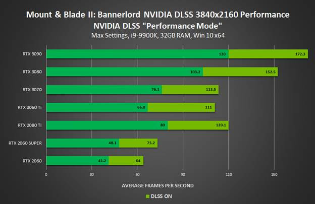 Em Mount & Blade II: Bannerlord, o NVIDIA DLSS pode acelerar o desempenho em até 50% em 4K, permitindo 60 FPS em todas as GPUs GeForce RTX.