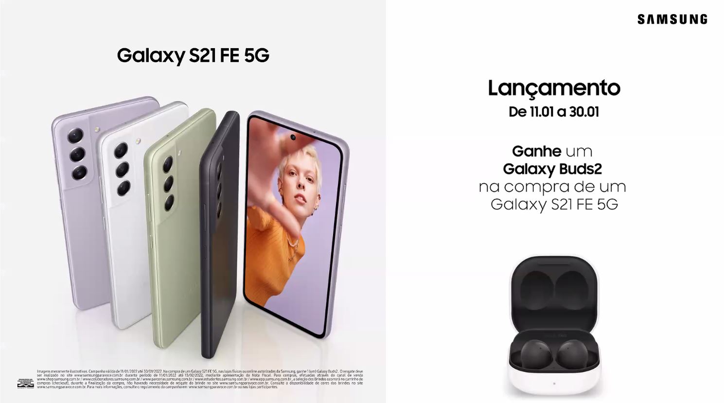 A Samsung também preparou promoções para o lançamento do Galaxy S21 FE 5G. Comprando o smartphone no período de 11 a 30 de janeiro, o consumidor ganha o fone de ouvido sem fio Galaxy Buds2.