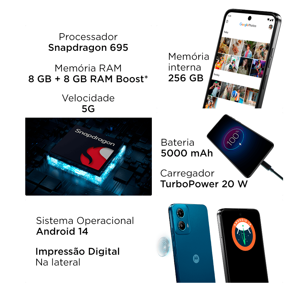 O moto g34 5G já chega com Android 14, que prioriza a saúde, a segurança e a proteção dos dados dos usuários, garantindo uma maior conscientização sobre o uso de dados do aplicativo e fornecendo proteção aprimorada contra acesso não autorizado. O Android 14 também oferece maior inclusão com recursos aprimorados de visão e audição, garantindo uma experiência de dispositivo fácil e personalizada para todos os usuários.