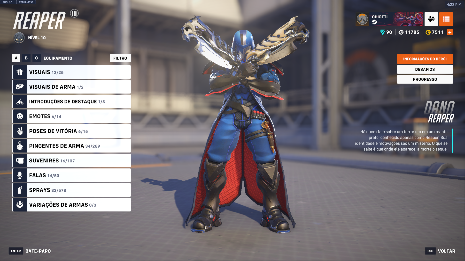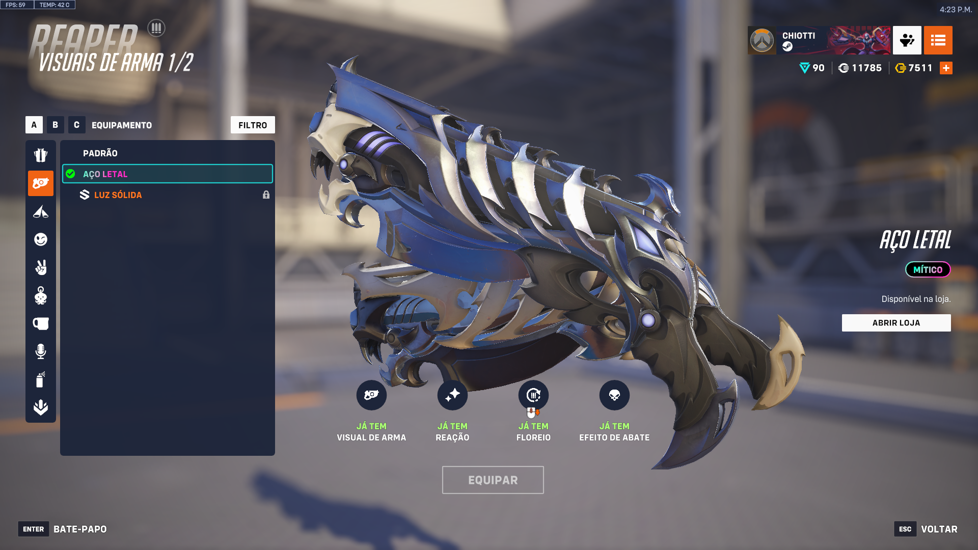 O nível 4 da Steel Death é onde a arma realmente brilha. Ao eliminar inimigos, sombras ondulantes e efeitos sonoros que ecoam a fúria do Reaper transformam cada abate em um momento cinematográfico. A Blizzard caprichou na integração da narrativa do personagem, com a arma servindo como uma extensão da psique torturada de Gabriel Reyes. Testei a skin em partidas e posso dizer que ela não só impressiona visualmente, mas também eleva a sensação de poder ao jogar com o Reaper.
