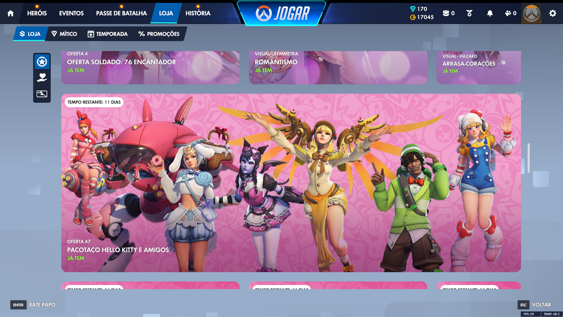 O destaque da Temporada 1 é o Pacotão Overwatch x Hello Kitty e Amigos, disponível na loja do jogo. Esse pacote reúne skins e itens com tema kawaii super fofos, lançados em 2026 para trazer um toque leve e divertido ao universo de Overwatch.