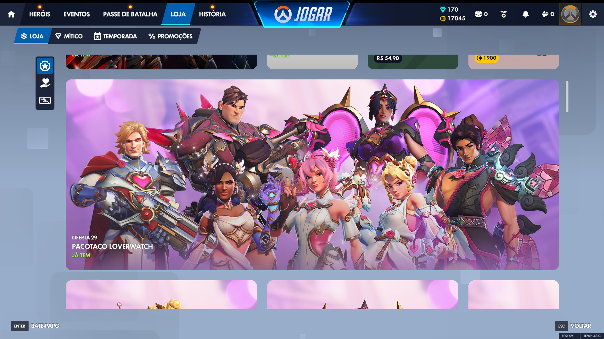 O destaque da Temporada 1 continua sendo o Pacotão Loverwatch, que apareceu na loja do jogo por R$ 54,90 ou 1.900 Moedas Overwatch. Esse pacote reúne 29 itens com tema romântico, todos lançados em 2026 para acompanhar o clima do Dia dos Namorados.As skins incluídas são: