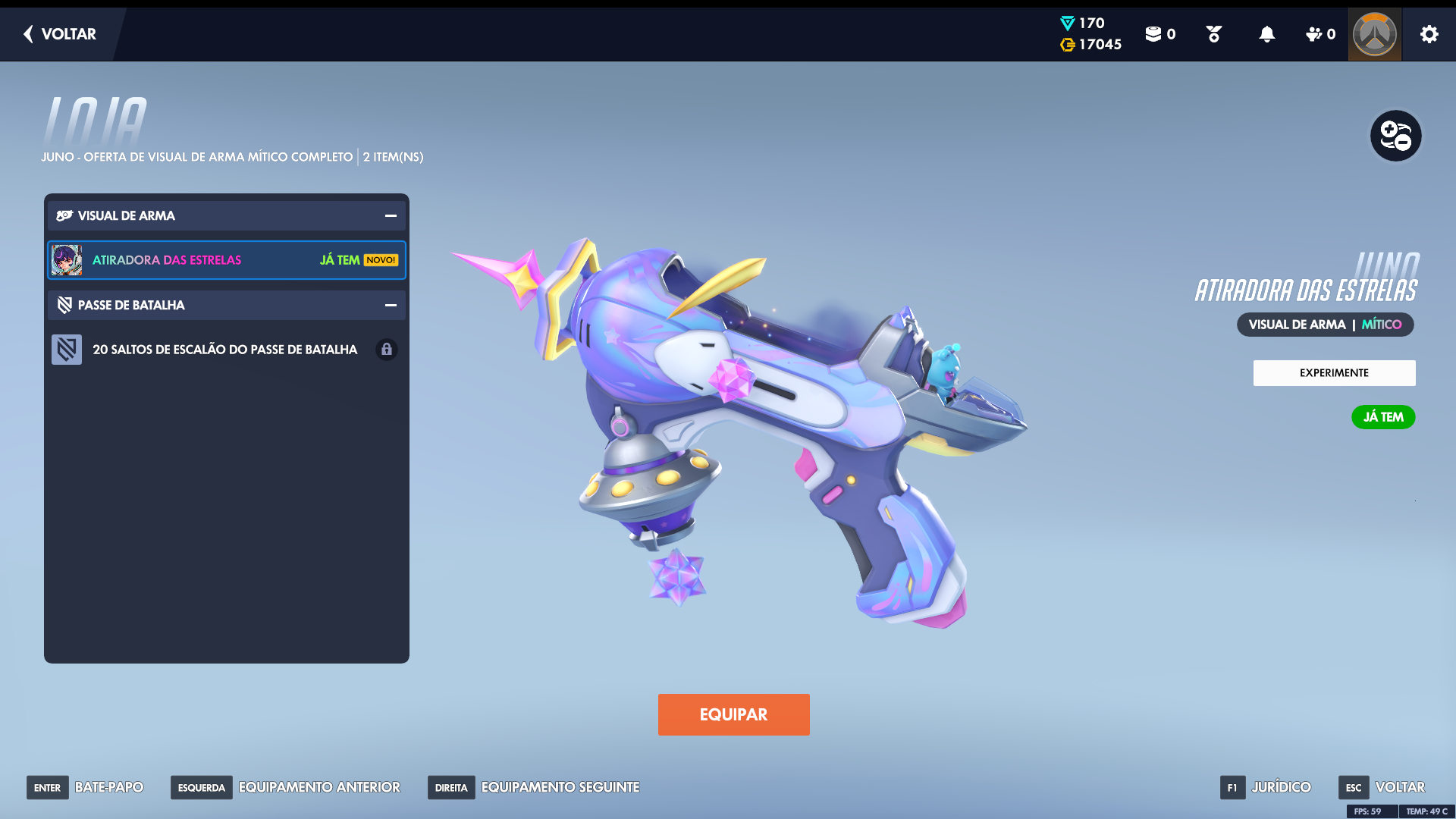 O Visual de Arma Mítico Atiradora das Estrelas para Juno é um dos destaques da loja da Temporada 1, disponível em bundle completo com 20 pulos do passe ou pode trocar pelos cristais.