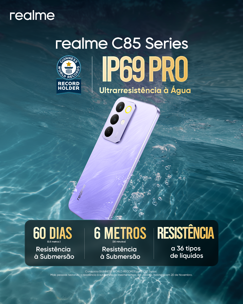 O realme C85 possui IP69 Pro, o mais alto nível de resistência à água da indústria, que incorpora as normas IP69K, IP69, IP68 e IP66, normalmente presentes somente em rugged phones (“celulares robustos”) e resiste a 36 tipos de líquidos. A ultrarresistência à água do realme C85 garantiu a ele entrar no Guinness World Records como “Maior número de pessoas realizando simultaneamente um teste de resistência à água em um celular” em novembro do ano passado, na Indonésia, onde 280 unidades do realme C85 foram submersas em uma piscina por dois minutos e todas seguiram funcionando normalmente após serem retiradas da água.